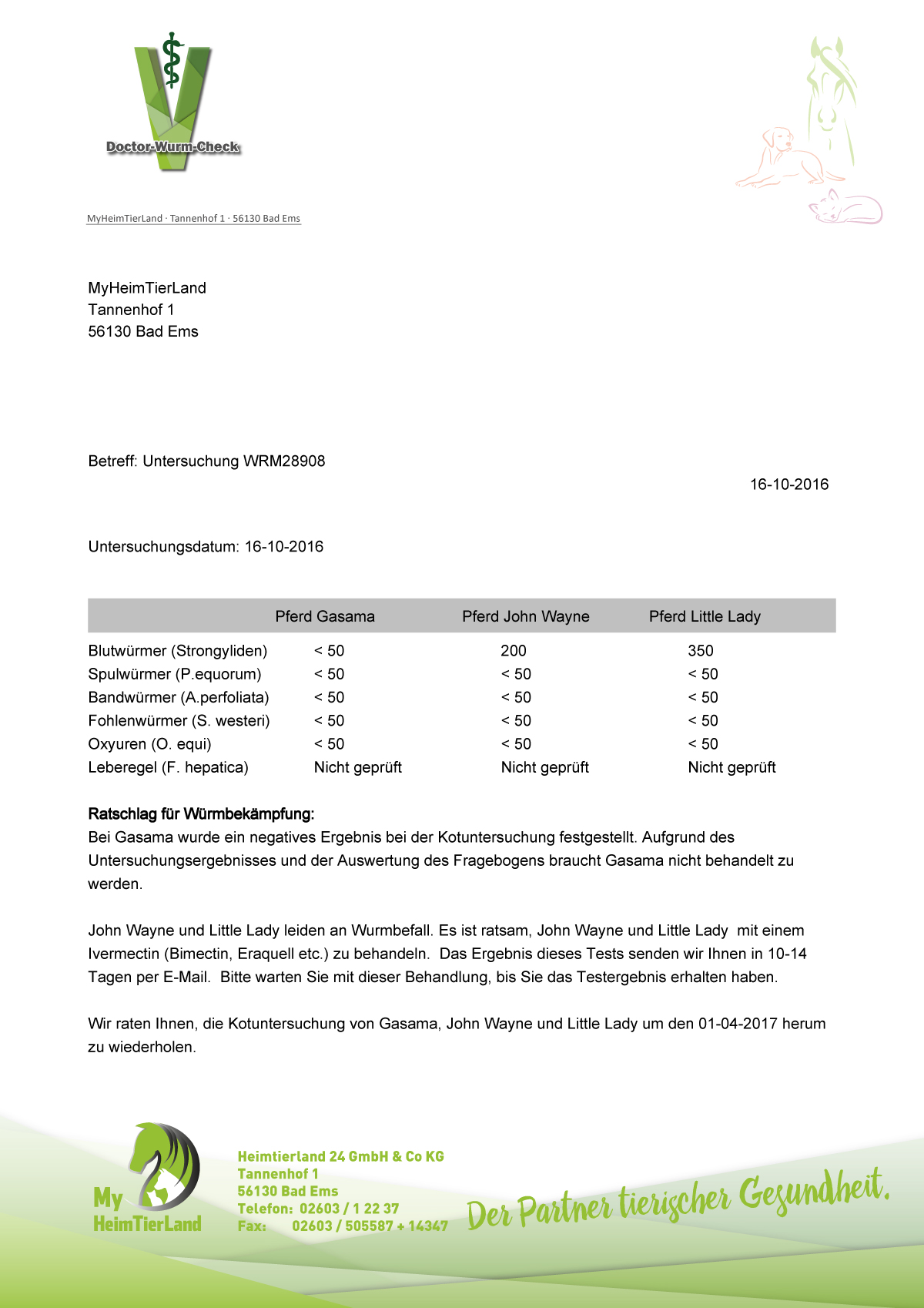 EPG | < 50 | keine Wurmkur nötig (Das Ergebnis ist nie niedriger als < 50 - Es ist international vereinbart, dass der Wert nicht 0 sein kann) |